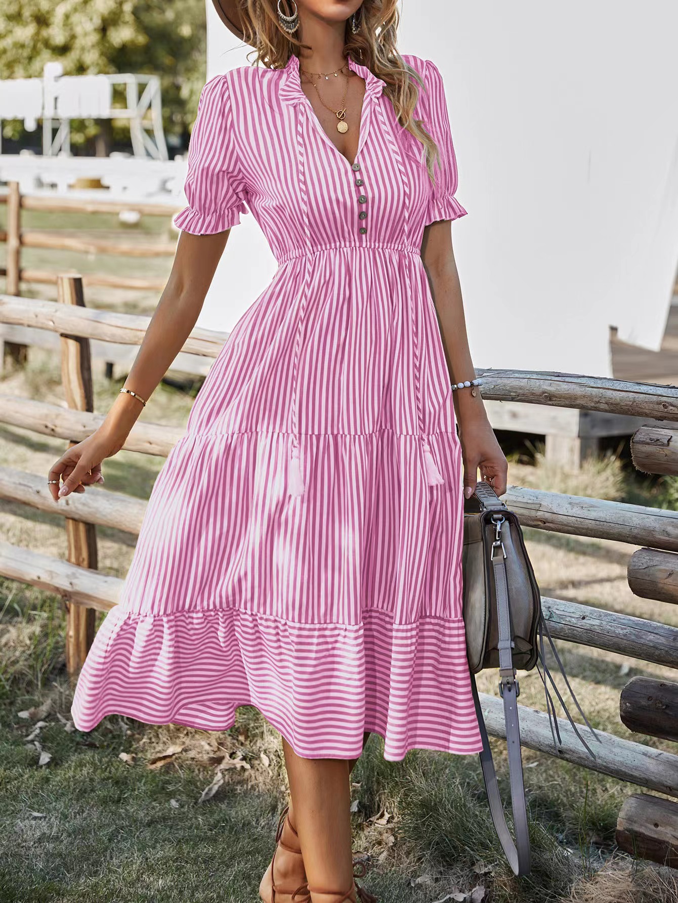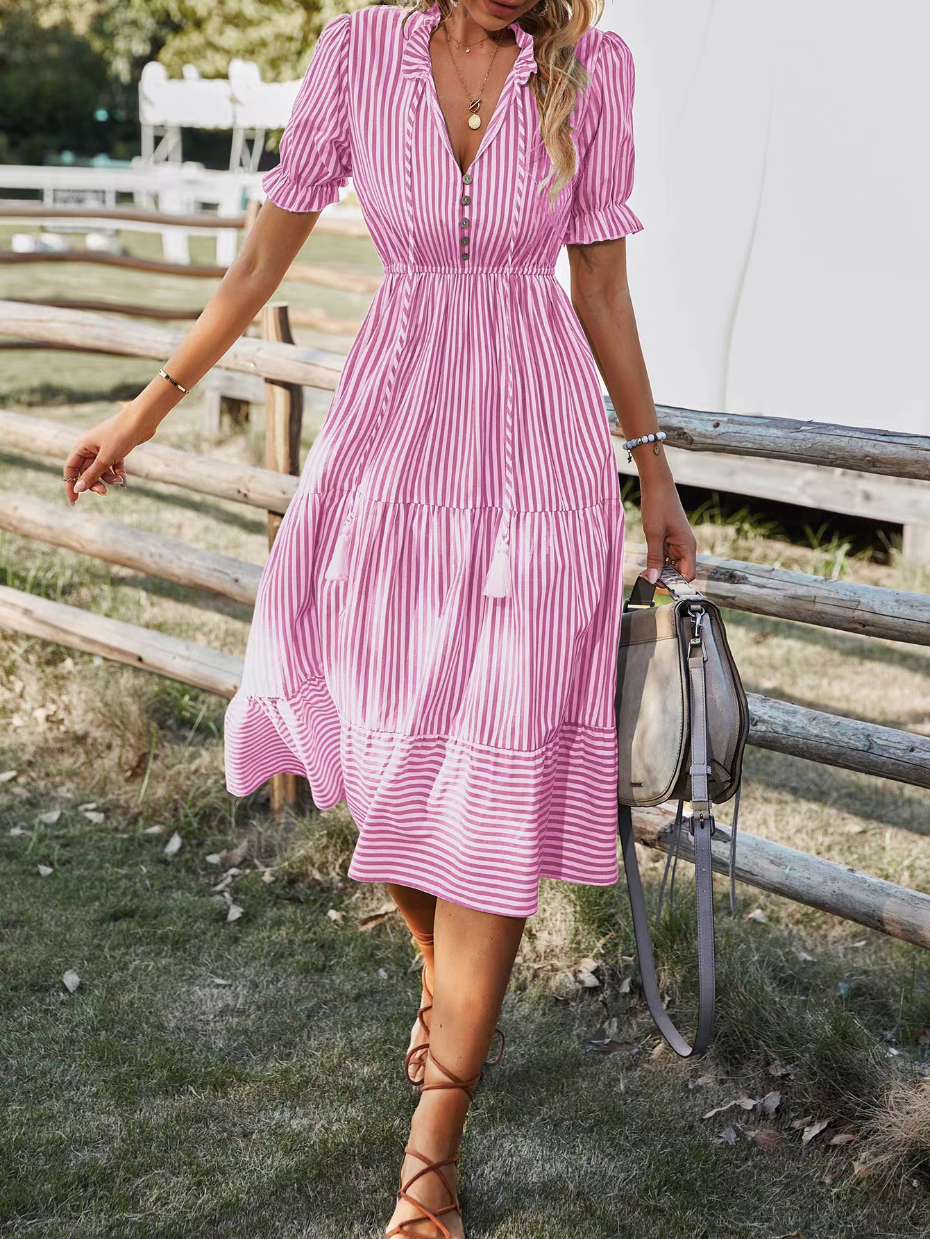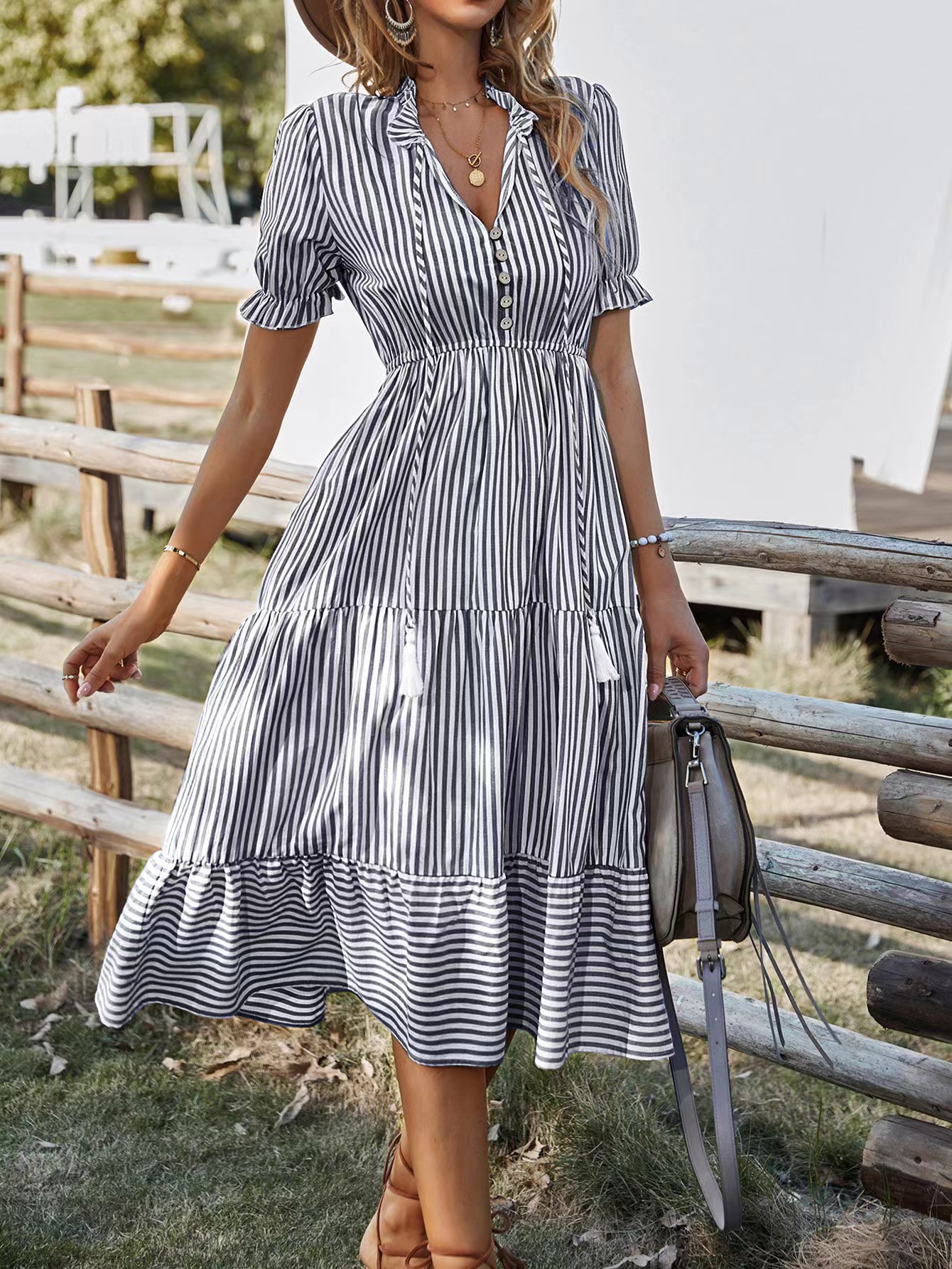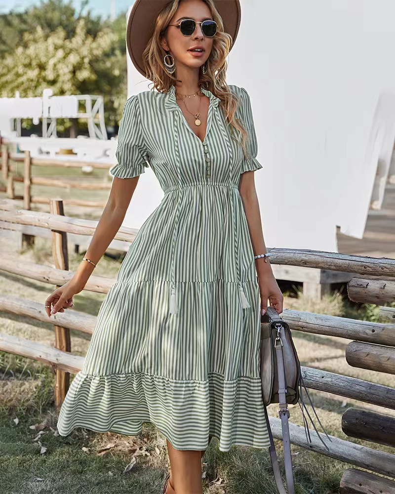V领松紧腰短袖大摆条纹连衣裙参数